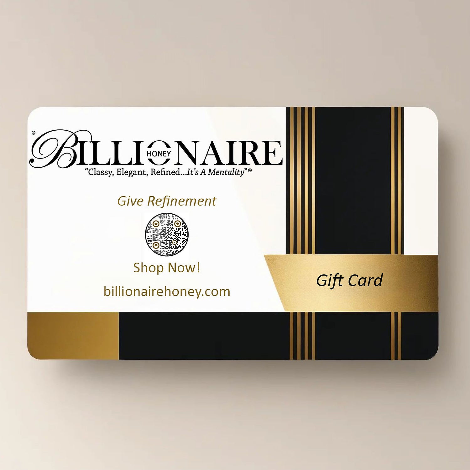 Give the gift of Refinement with the Billionaire Honey® E-Gift Card: Elevate your loved ones' style with the gift of choice & timeless elegance. Unwrap possibilities, unwrap sophistication.